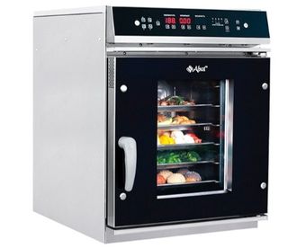 Материал корпуса: нержавеющая сталь. 5 режимов работы: конвекция (до 270°С), пар (до 100°С), пар при низких температурах (от 30 до 98°С), конвекция с паром (от 35 до 270°С), разогрев (от 30 до 160°С). Память до 110 программ пользователя, быстрый выход на рабочий режим. Парогенератор, регулировка влажности (от 0 до 100%). Таймер до 10 часов. Трехканальный температурный щуп. Реверсивный вентилятор. Вентилируемая дверь пароконвектомата открывается в 2 этапа, система закрывания - "свободные руки". Модель оснащена подсветкой, легкосъемным жировым фильтром. Панель управления на русском языке. Черный дизайн. Доп. опции: комплект гастроемкостей, подставка под пароконвектомат, душирующее устройство.