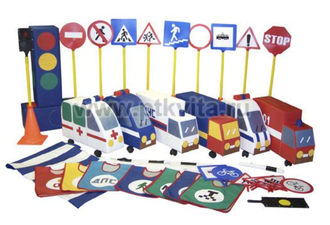 Светофоры - 4 шт.Жезл регулировщика - 1 шт. Светофор пешеходный - 1 шт. Жилет - 7 шт.(01, 02, 03, ДПС, МЧС, такси, пешеход) Разделительная полоса - 4 шт. Ограничительная полоса - 6 шт. Дорожные знаки - 18 шт. Зебра - 4 шт. Машинки - каталки (ДПС, Пожарная, Грузовик, МЧС, Скорая, Полиция) - 6 шт. Стойка для дорожных знаков - 10 шт. объем: 0,7 м3 ; 4 места "Скорая помощь" 65*20*55 см. "ДПС" 65*20*55 см. "Пожарная" 70*20*50 см. "Полиция" 65*20*55 см. "МЧС" 70*20*50 см. "Грузовик" 70*20*50 см. "Светофор" 25*25*75 см. "Зебра" 60*120 см.