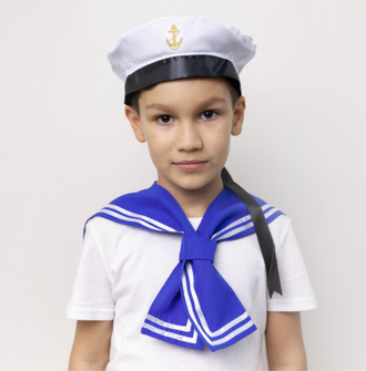 Комплектация: бескозырка с резинкой сзади, воротник - стилизованный под гюйс с 2-мя полосками, с петелькой.