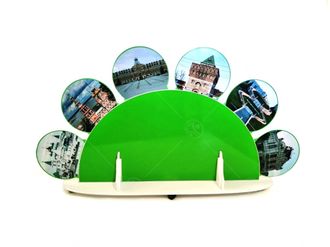 Дидактическая игра "Город" выполнено из МДФ. Пособие состоит из основания-площадки белого цвета, поля для крепления лепестков с одной стороны желтого цвета, с другой стороны зеленого и набора из шести лепестков с изображениями достопримечательностей г. Сургута. Высота основания веера - 0,67м, ширина - 1,4м. Диаметр лепестков - 0,34 м.