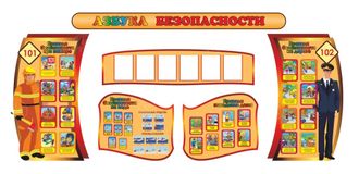 Комплект стендов "Азбука безопасности" состоит из шести отдельных элементов. Размер цельной композиции 3,9*1,8м. В стендах присутствует иллюстрированная информация по технике безопасности: правила безопасности нпри пожаре, на воде, дома, на дороге. Информация указанная на стенде актуальна для всех организаций. И отлельная часть композиции стендов с шестью карманами А4. тенды можно заказать как композицией, так и по отдельности.