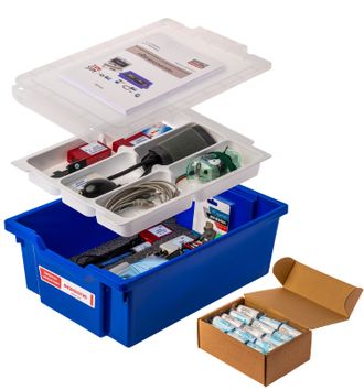 Цифровая лаборатория укомплектована в специальный пластиковый контейнер, который закрывается прозрачной пластиковой крышкой. Комплект оборудования и датчики в контейнере располагается на специальных ложементах