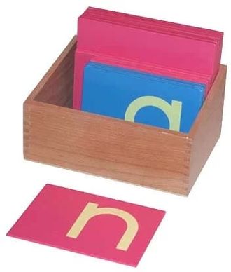 В комплект входит деревянный ящик, в котором находятся розовые и голубые дощечки с нанесёнными на них шероховатыми буквами печатного английского алфавита.