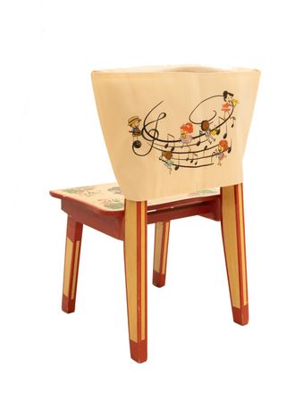 Описание: кармашек надевается на спинку стула. Выполнен в нейтральном цвете. С картинкой на музыкальную тематику. Он легко надевается, в объемный карман можно положить весь раздаточный материал для занятия или утренника.