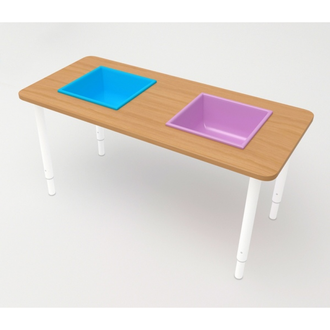 Столешница детского стола изготовлена из ЛДСП, благодаря чему сохранит исходный внешний вид под воздействием любых жидкостей, что важно для стола в детском саду. Для уборки тазы легко извлекаются, моются и помещаются на прежнее место.